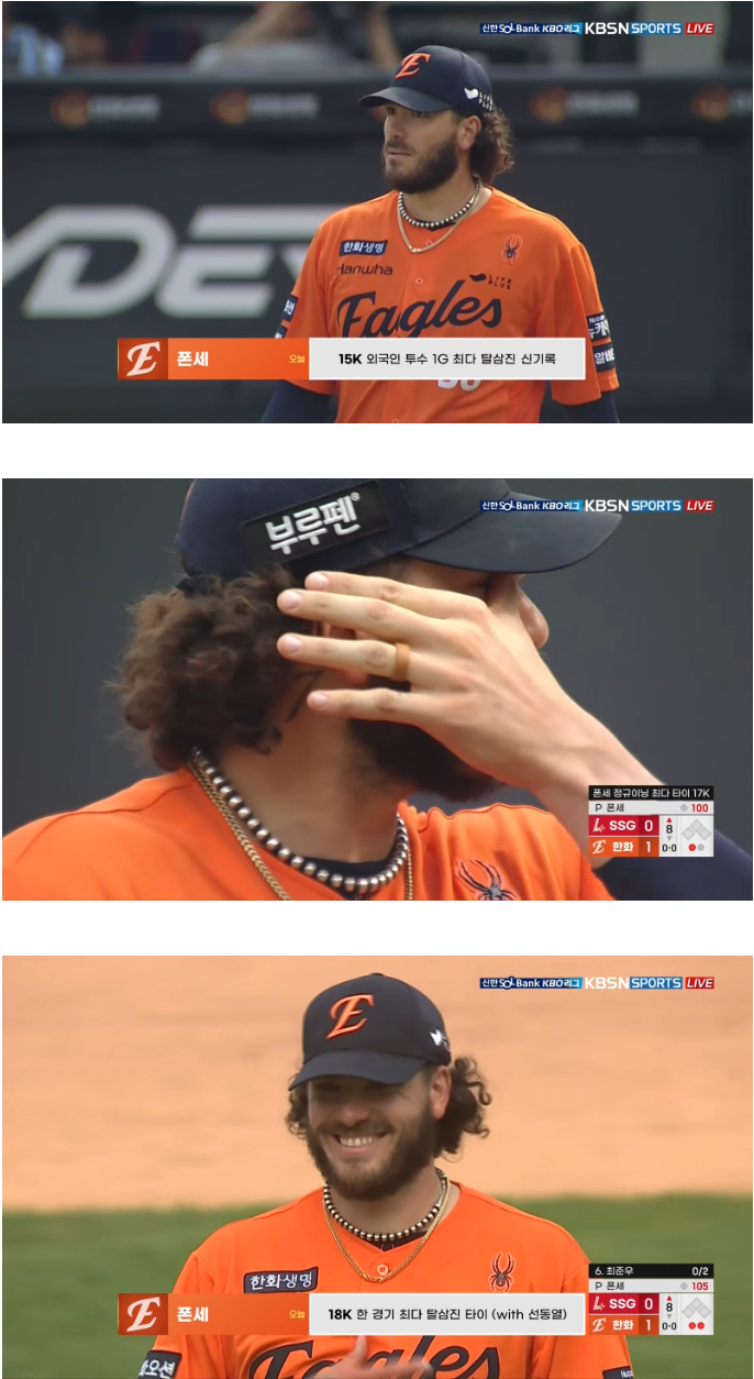 선동열이 광주 빙그레 이글스(현 한화)전에서 달성한 18개와 타이지만 선동열은 13이닝까지 던진 거. 정규이닝으로는 당연히 폰세 18탈삼진이 KBO리그 한 경기 최다 탈삼진 신기록. 이전 기록은 2010년 5월11일 청주 LG트윈스전 류현진 17개.