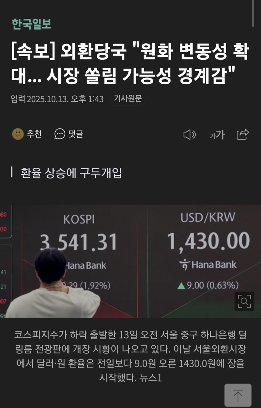 * | [머니] | 변동성 대책... 환율 상승 구두 개입 [3] | 59와썹 | 2025/10/13 |
