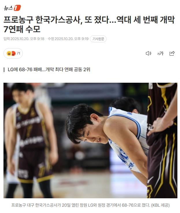 * | [스포츠] | 남농 가스공사, 역대 세 번째 개막 7연패 수모 [1] | 오구와꼬유 | 2025/10/21 |