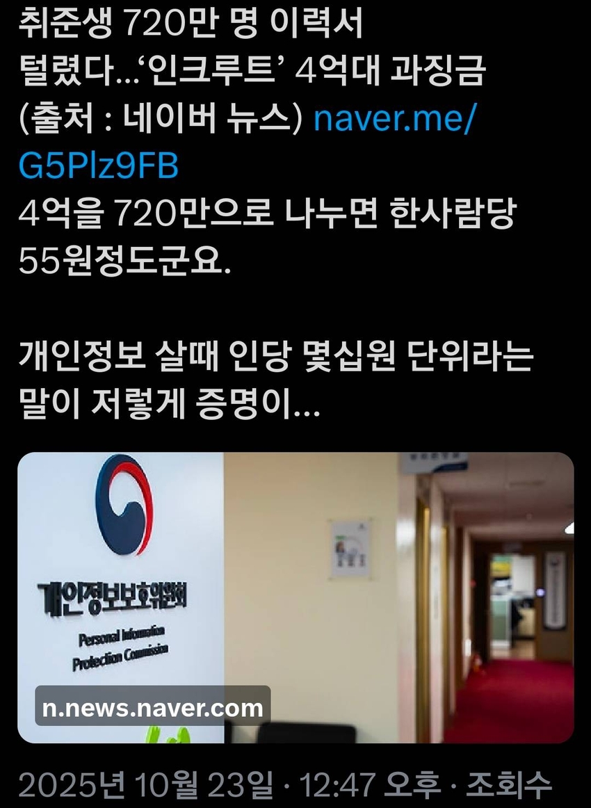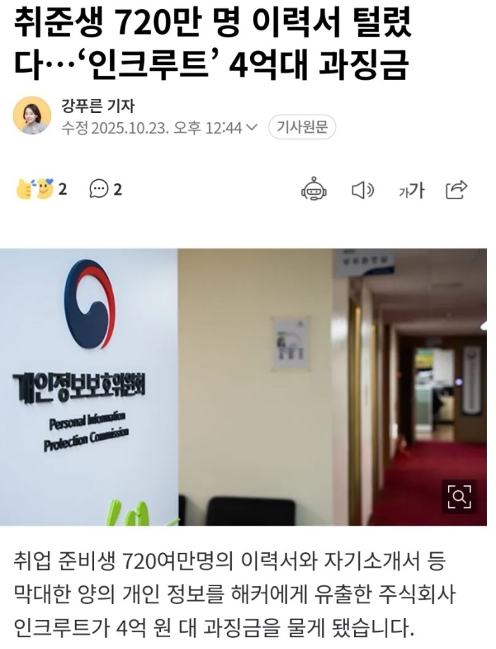| * | [머니] | 취준생 720만명 이력서 털린 인크루트 [1] | 585뭉개리 | 2025/10/24 |
