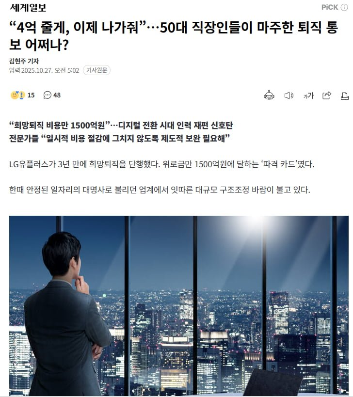 | * | [머니] | 4억 줄게, 이제 나가줘.. 50대 직장인들이 마주한 퇴직 통보 [1] | 카와이데쓰 | 2025/10/27 |