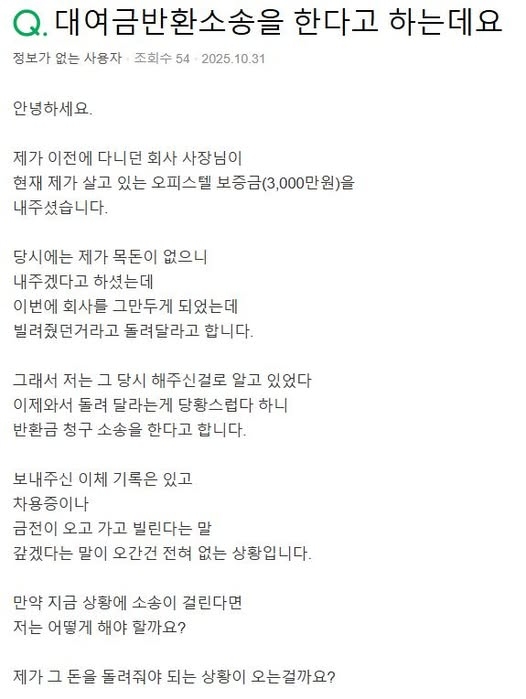 | * | [프리] | 퇴사한다니까 사장님이 대여금 반환소송을 한다네요 [1] | 핸손은밥이지 | 2025/11/02 |