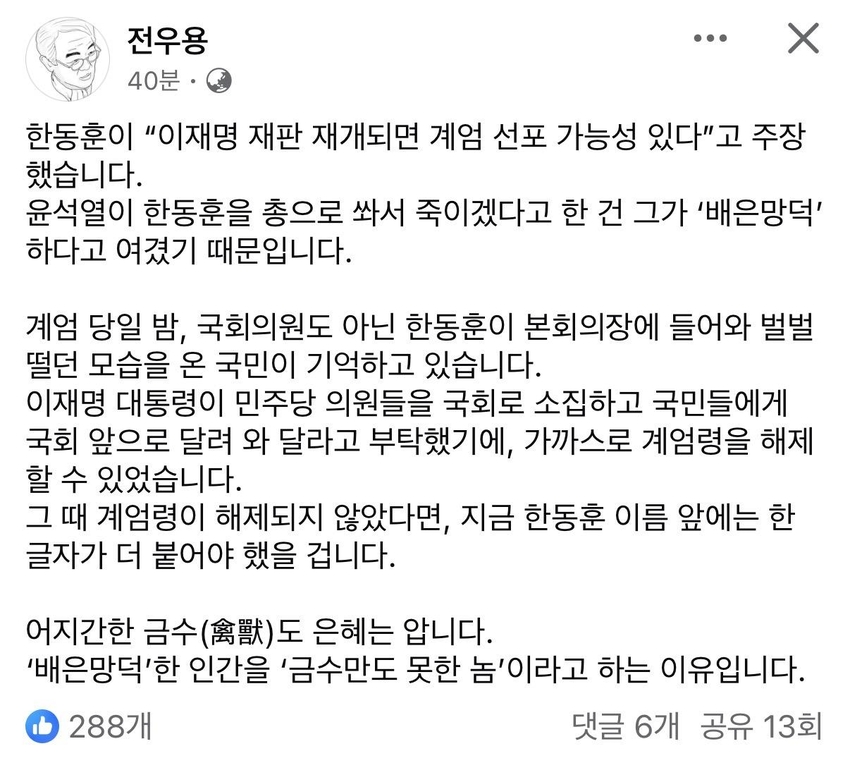 16057 [소셜] 윤석열 "한동훈 쏴죽일 것" 한동훈 "이재명 정권, 계엄령 선포할 수도" [1] 옥심아드로핀 2025/11/04