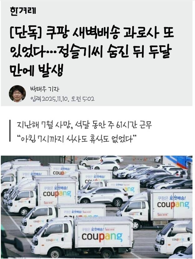 | * | [머니] | 쿠팡 새벽배송 과로사 또... [1] | owlwo | 2025/11/10 |