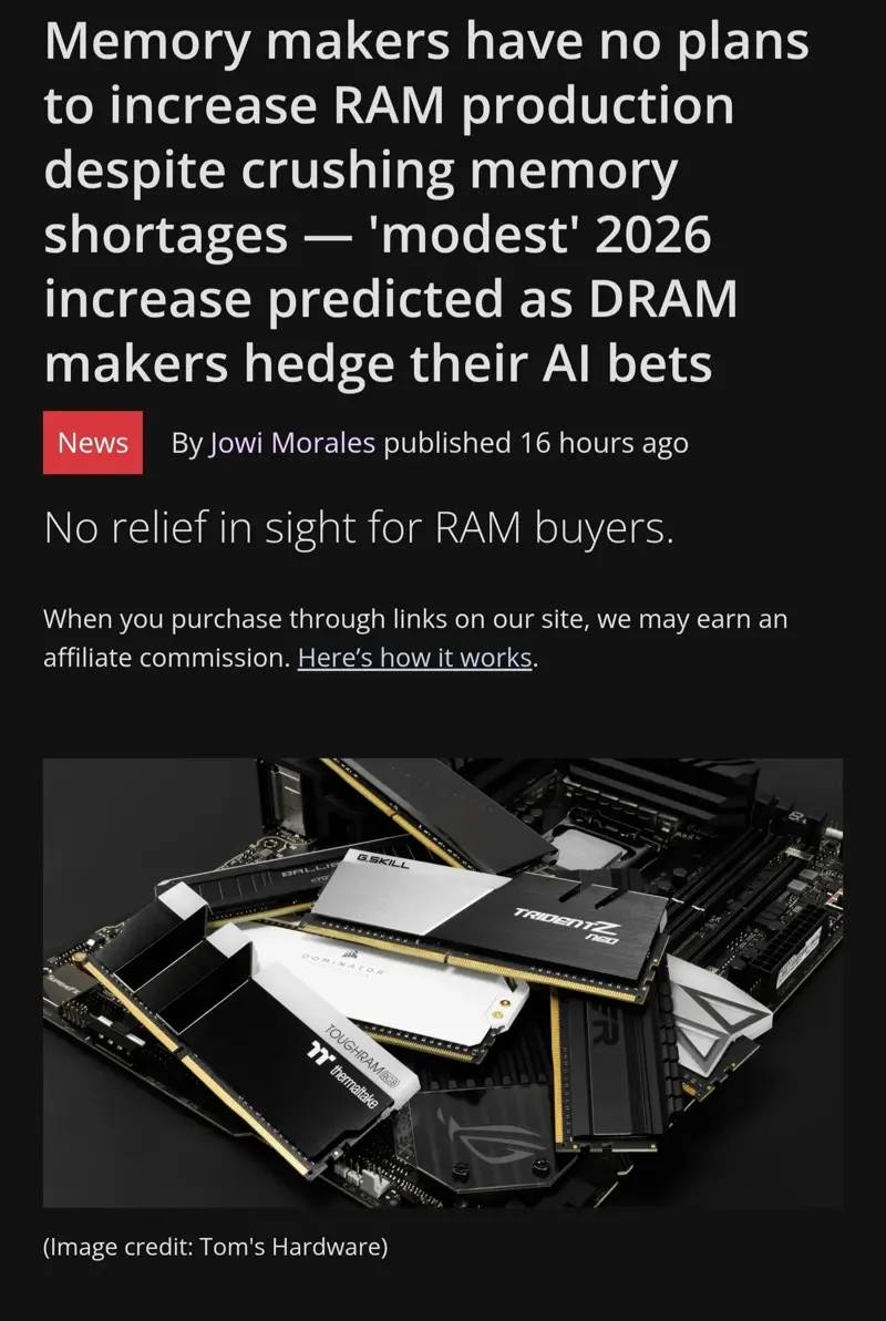 마이크론, SK하이닉스, 삼성전자 등 주요 메모리 제조사들은 올해 540억 달러 규모의 설비투자를 집행하지만, 이는 대부분 AI 가속기용 HBM 칩 개발에 집중. DRAM 부문 투자가 전년 대비 14% 늘었음에도 실제 생산량 증가는 없고, 실질적으로 DRAM생산라인 HBM생산라인으로 전환 시작해서 공급 감소 전망. 그리고 2023년 과잉 생산으로 저가에 재고떨이했던 만큼 생산시설 확충도 없을 거라는 게 업계 전망.