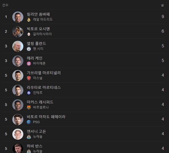 아래는 득점 순위