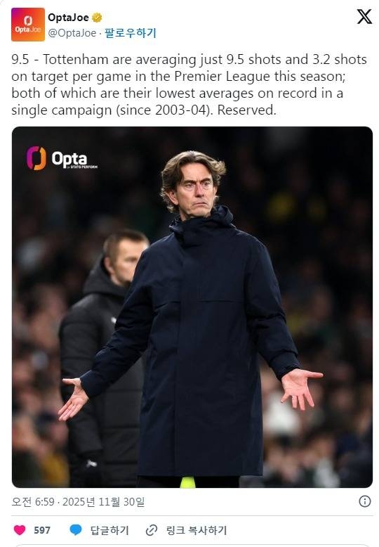 토트넘은 이번 시즌 프리미어리그에서 경기당 평균 슈팅 9.5회, 유효슈팅 3.2회 기록 중