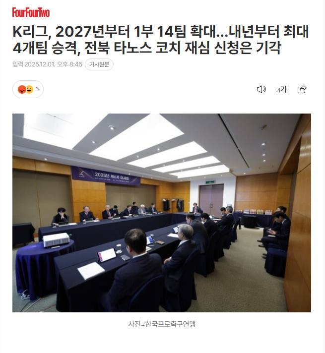 | * | [스포츠] | K리그, 2027년부터 1부 14팀...전북 타노스 코치 재심 신청은 기각 [1] | 카와이데쓰 | 2025/12/01 |