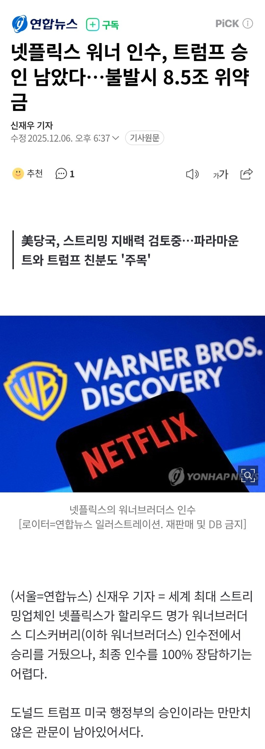 | * | [머니] | 넷플릭스 워너 인수, 트럼프 승인 남았다…불발 시 8.5조 위약금 [2] | 발광하는심술 | 2025/12/06 |