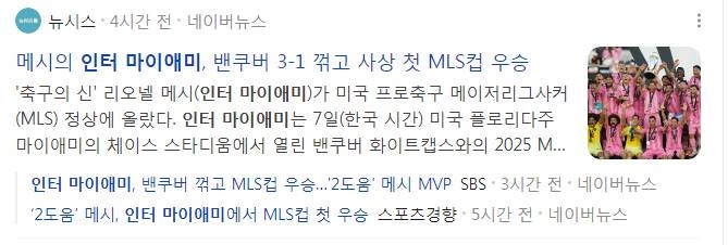 | * | [스포츠] | 메갓 귀환으로 인터 마이애미 창단 첫 MLS컵 우승 [1] | supermass | 2025/12/07 |