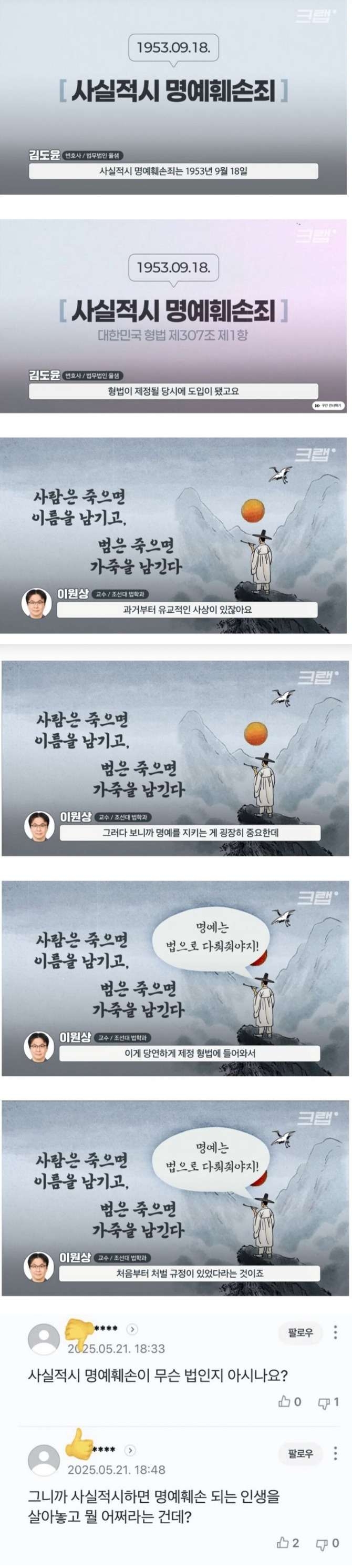 | * | [프리] | 사실적시 명예훼손죄가 생긴 이유와 따끔한 일침 [1] | habbySE | 2025/12/20 |