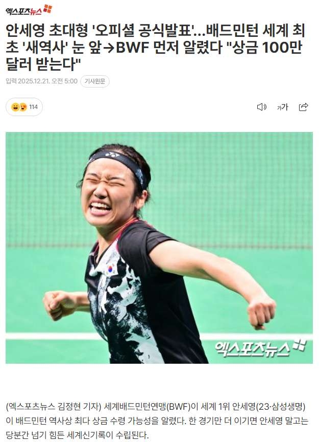 세계배드민턴연맹(BWF)에 따르면 만약 안세영이 내일 왕즈이를 이기면 한 시즌에 상금 100만 달러를 버는 최초의 배드민턴 선수.
