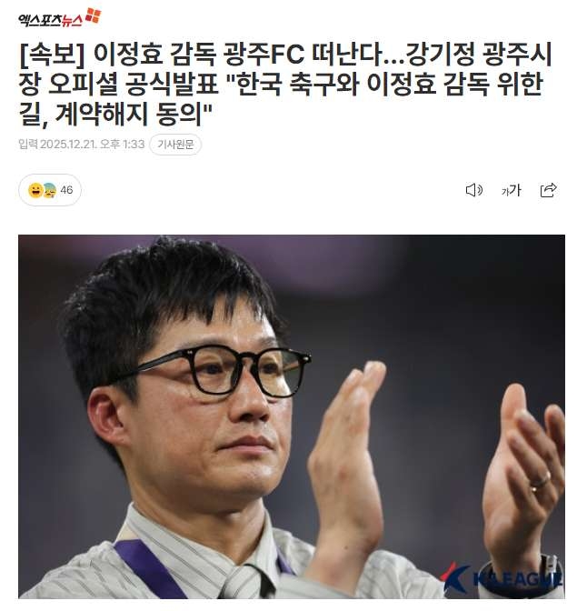 | * | [스포츠] | 이정효 감독 광주FC 떠난다…강기정 광주시장 오피셜 공식발표 [1] | 59와썹 | 2025/12/21 |