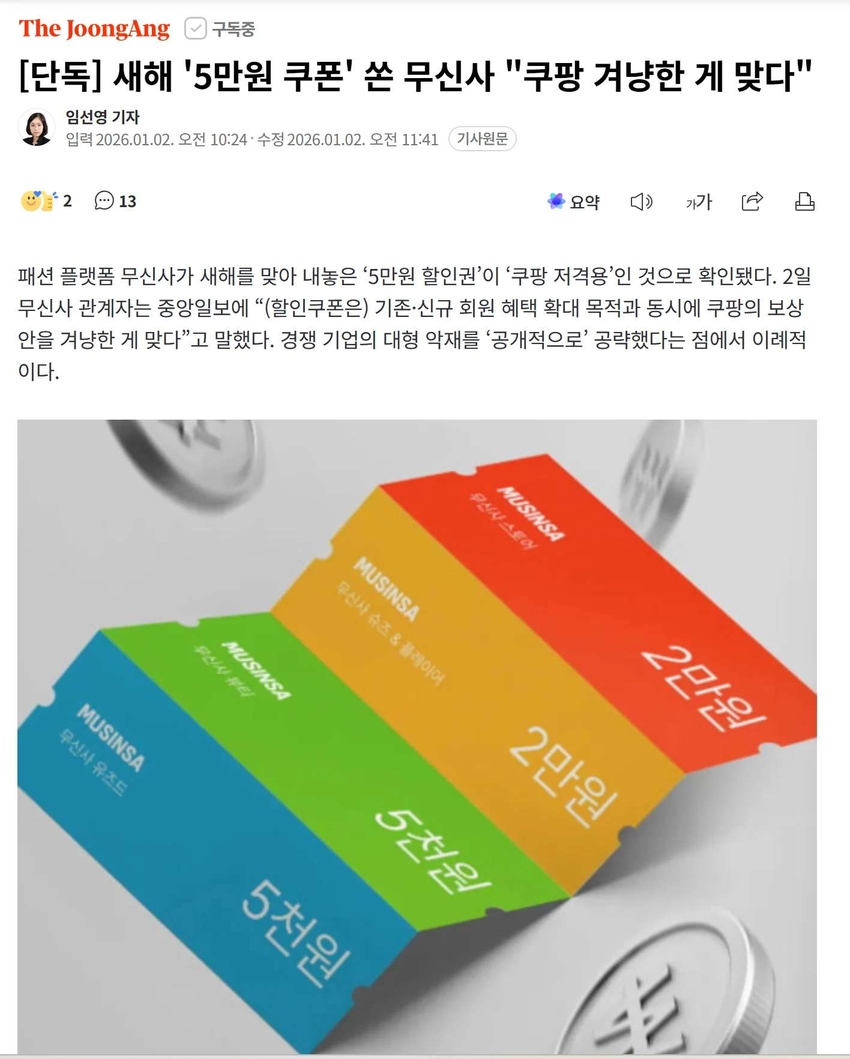 | * | [머니] | 쿠팡 겨냥해 쿠폰 쏜 무신사 | 긍정의짧은짤 | 2026/01/02 |