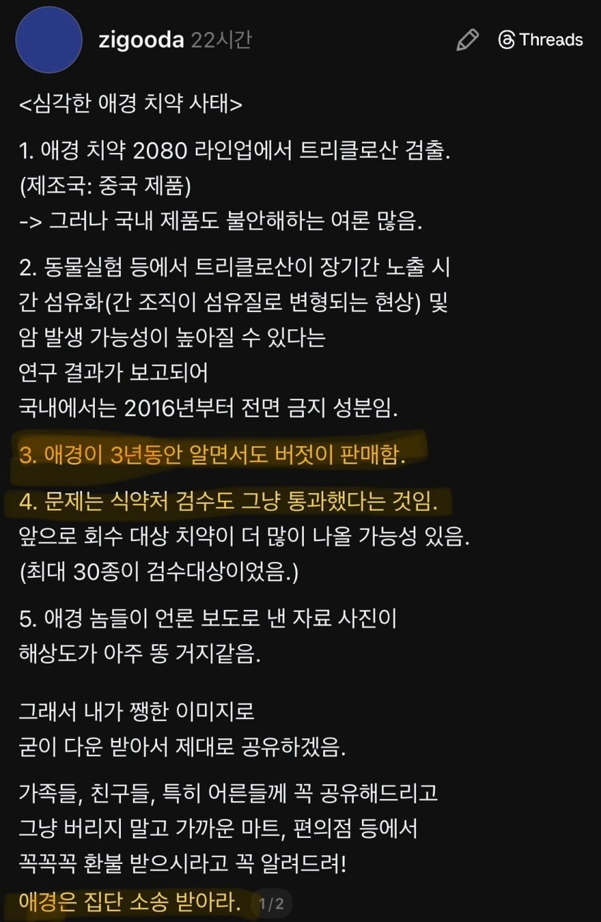 | * | [머니] | "애경 2080 치약 사태" 리콜로 끝낼 일이 아니네요 ㄷㄷ [1] | 백스파이스 | 2026/01/10 |