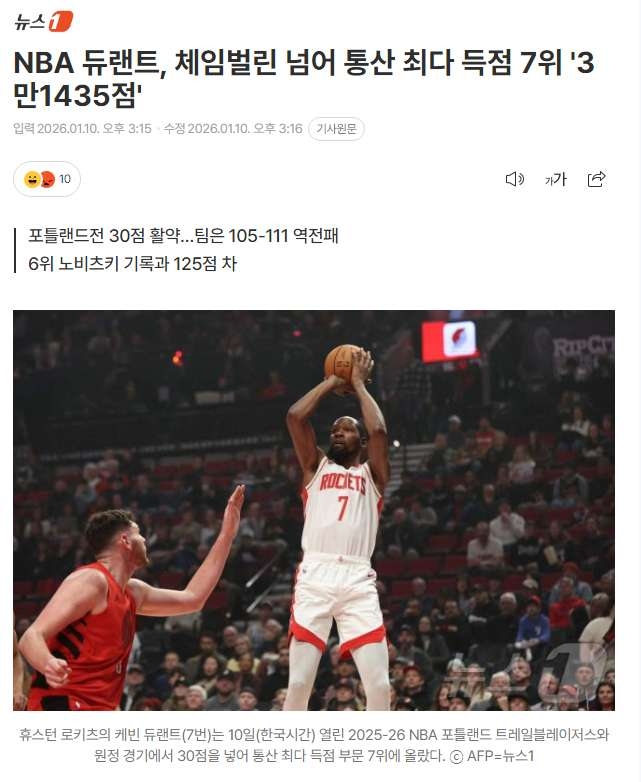 | * | [스포츠] | 듀랜트, 체임벌린 넘어 통산 최다 득점 7위 | 발광하는심술 | 2026/01/10 |