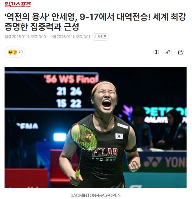 | * | [스포츠] | 안세영, 9-17에서 대역전승 | 양밤갱2개 | 2026/01/11 |
