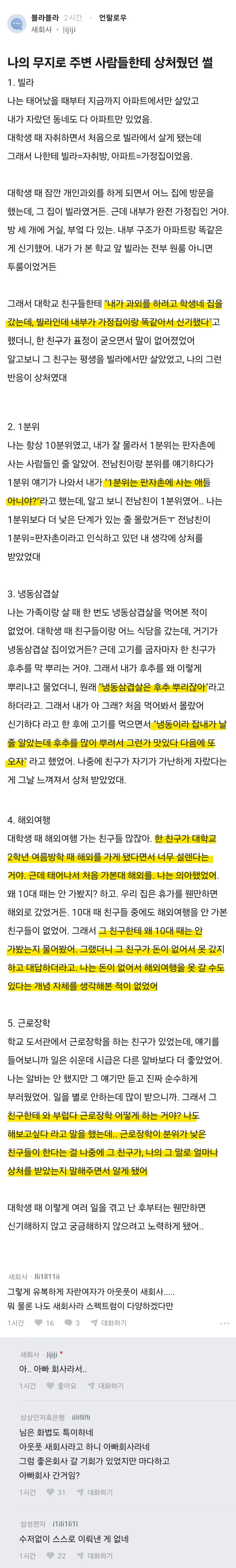 | * | [프리] | 철없는 금수저 대학생이 가난한 사람들에게 상처 줬던 썰들 | 하춘하 | 2026/01/19 |