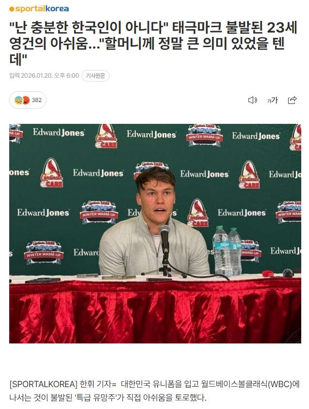 세인트루이스 카디널스 산하 마이너 구단에서 뛰고 있는 내야수 JJ 웨더홀트. 웨더홀트는 할머니가 한국인인 '쿼터 코리안' 선수. 본인의 SNS에서는 아예 영단어 'Grandmother'가 아닌 '할머니(Halmoni)'라는 단어를 쓰기도 했답니다. 근데 조건을 충족하지 못해 차출을 못하게 됐다네요. 부모 중 한 명의 출신지나 국적을 따라서 대표팀을 선택할 수 있는데 여기서 문제가 생겼답니다 아쉽네요.
