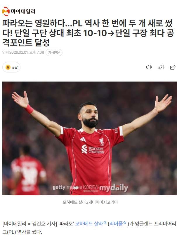| * | [스포츠] | 살라, 단일 경기장 최다 직접 득점 관여 기록 | supermass | 2026/02/01 |