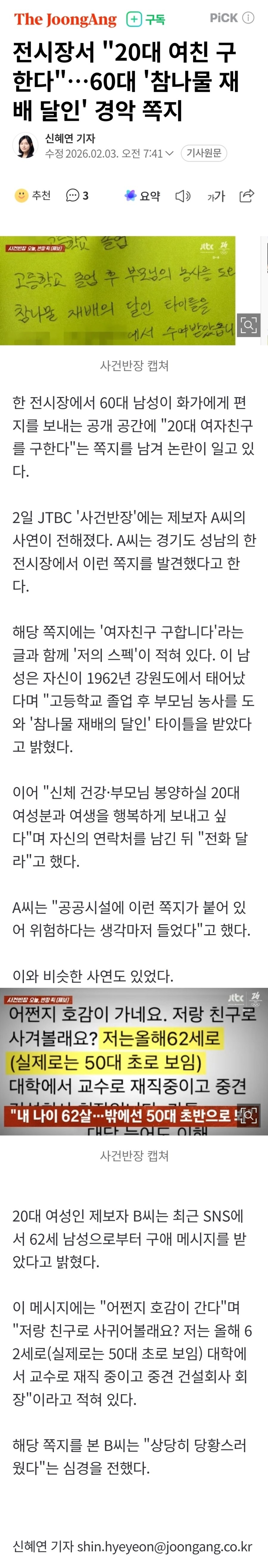 | * | [소셜] | 20대 여친 구한다는 60대 참나물 재배 달인 | habbySE | 2026/02/03 |