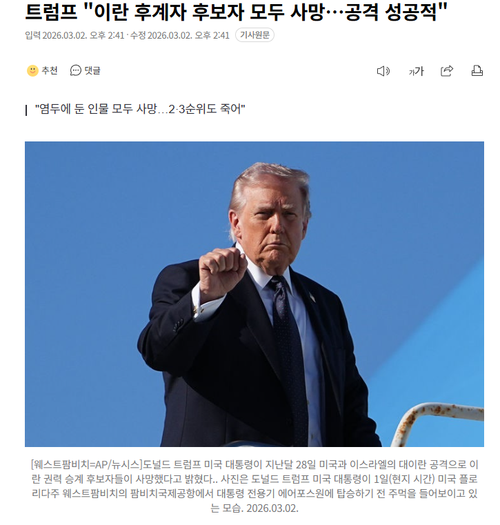 | * | [소셜] | 트럼프 "이란 후계자 2 3위도 사망...공격 성공적" | 시누의가방 | 2026/03/02 |