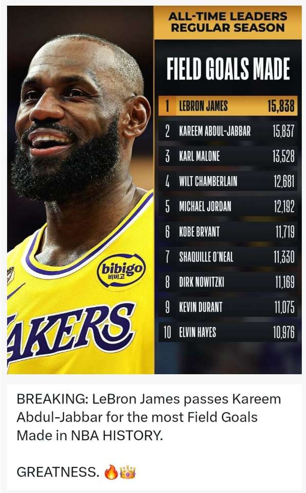 르브론은 오늘 덴버와의 경기에서 장장 23시즌 만에 카림 압둘자바를 제치고 NBA 역사상 자유투를 제외하고 가장 많은 필드골을 성공시킨 선수로 등극.