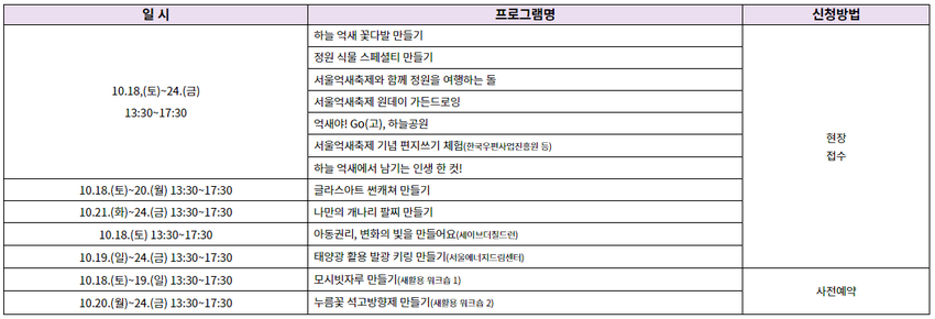 한편 더욱 상세한 행사 관련 정보는 축제 안내 홈페이지(https://parks.seoul.go.kr/story/news/detailView.do?bIdx=3598)에서 확인할 수 있으며 기타 사항은 서부공원여가센터(02-300-5567)로 문의.