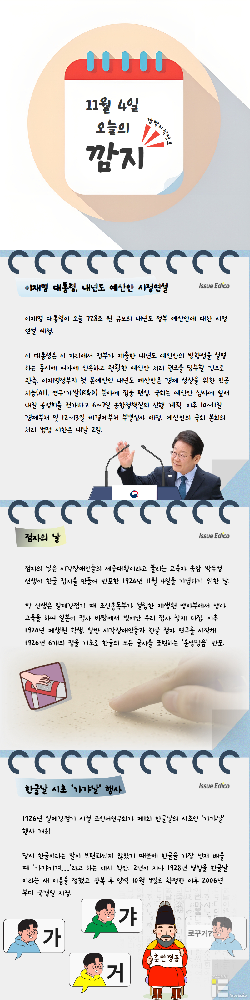 이재명 대통령이 오늘 728조 원 규모의 내년도 정부 예산안에 대한 시정 연설 예정. 이 대통령은 이 자리에서 정부가 제출한 내년도 예산안의 방향성을 설명하는 동시에 여야에 신속하고 원활한 예산안 처리 협조를 당부할 것으로 관측. 이재명정부의 첫 본예산인 내년도 예산안은 경제 성장을 위한 인공지능(AI), 연구·개발(R&D) 분야에 집중 편성. 국회는 예산안 심사에 앞서 내일 공청회를 전개하고 6~7일 종합정책질의 진행 계획. 이후 10~11일 경제부처 및 12~13일 비경제부처 부별심사 예정. 예산안의 국회 본회의 처리 법정 시한은 내달 2일.