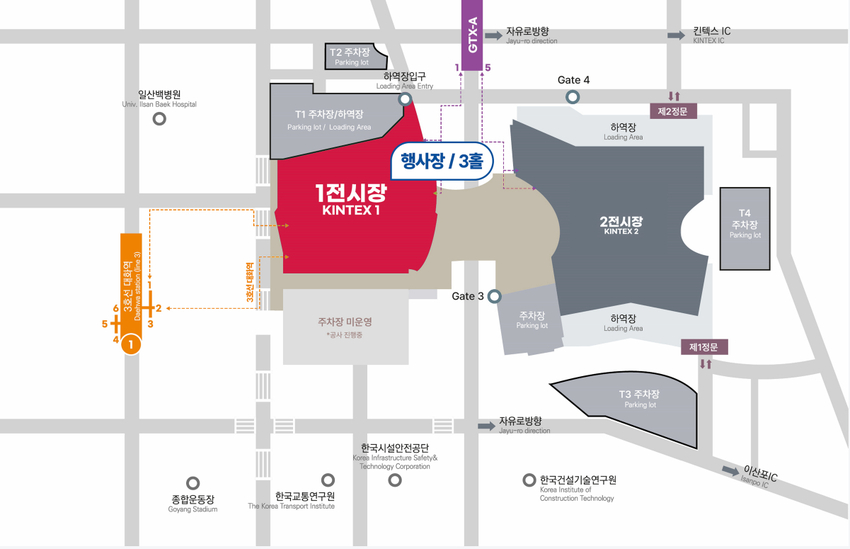 주차시설은 킨텍스 내 전시장 주차장 사용 가능. 주차 요금은 일반 승용차 기준 20분에 약 1200원, 추가 10분당 600원이며 일일 최대 1만2000원 부과. 행사 당일 주차장은 혼잡할 수 있으므로 가급적 대중교통 이용 권장.