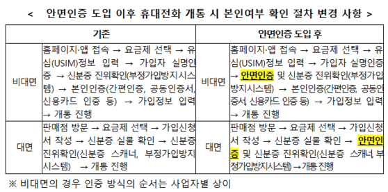 휴대전화 개통 절차에 도입되는 안면 인증은 신분증 얼굴 사진과 신분증 소지자의 실제 얼굴을 실시간 대조하는 것으로 명의도용 방식의 대포폰 개통을 원천 차단하기 위해 마련됐다. 정식 도입은 내년 3월 23일부터다.