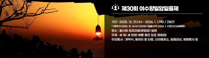 [IE 문화] 금주 [나들이 가GO이슈] 중 무작위 선정 행사는 오늘부터 내일까지 이틀간 전남 여수시 돌산읍 임포마을 향일암 일출공원 및 향일암 일원에서 '새 빛! 새 희망! 해를 품은 임포 향일암!'을 기치로 빛낼 '여수향일암일출제'.