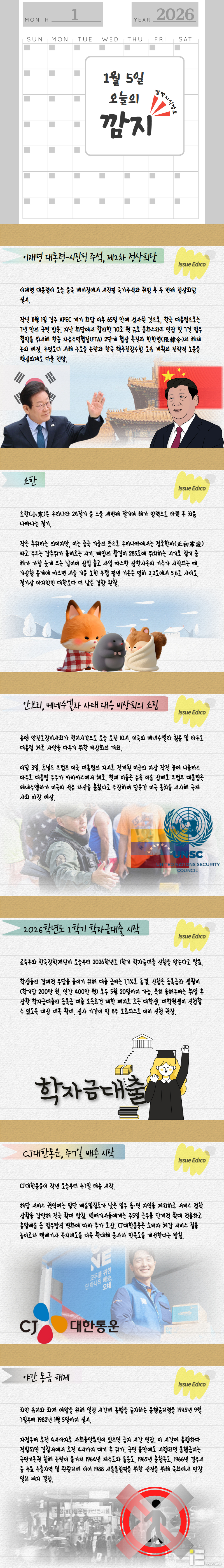 이재명 대통령이 오늘 중국 베이징에서 시진핑 국가주석과 취임 후 두 번째 정상회담 실시. 지난해 11월 1일 경주 APEC 계기 회담 이후 65일 만에 성사된 것으로, 한국 대통령으로는 7년 만의 국빈 방문. 지난 회담에서 합의한 70조 원 규모 통화스와프 연장 및 7건 업무협약을 위시해 한중 자유무역협정(FTA) 2단계 협상 촉진과 한한령(限韓令)의 해제 논의 예정. 특히 서해 구조물 논란, 한국 핵추진잠수함 보유 계획의 전략적 소통을 핵심의제로 다룰 전망.