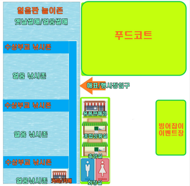 축제장 기본 동선은 입구 매표소에서 티켓 구매→빙어낚시존 선택(얼음판 또는 수상부교)→낚시 체험(1~2시간)→잡은 빙어 조리→옛날·얼음썰매 등 무료 체험→눈꽃 포토존 사진 촬영 순서 추천.