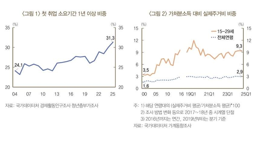 19일 한국은행(한은) 조사국 거시분석팀이 발표한 '청년세대 노동시장 진입 지연과 주거비 부담의 생애영향 평가'에 따르면 첫 취업 소요기간이 1년 이상 비중은 지난 2004년 24.1%에서 2025년 31.3%로 올랐다.