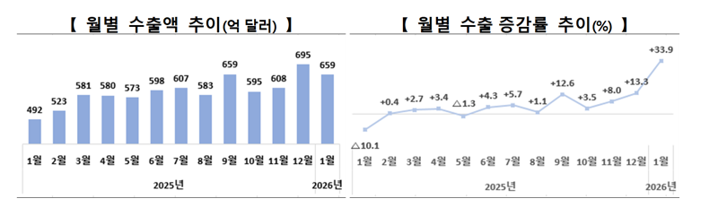 1일 산업통상자원부(산업부)가 발표한 '2026년 1월 수출입동향'에 따르면 지난달 우리나라 수출은 전년 동월 대비 33.9% 증가한 658억5000만 달러였다. 1월 중 처음으로 600억 달러를 넘긴 것. 조업일수를 고려한 일평균 수출 역시 작년 1월보다 14.0% 뛴 28억 달러로 역대 최고치를 기록했다.