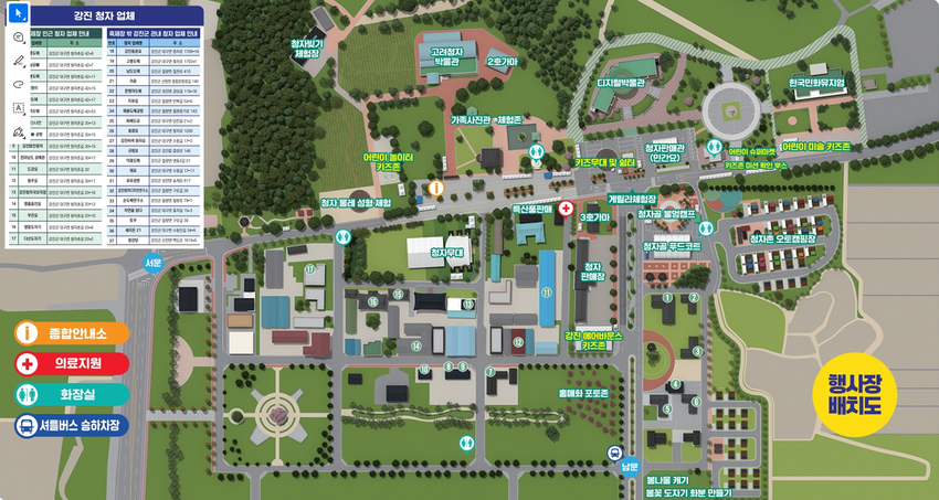 무료 임시 셔틀버스는 축제 동안 강진 시외버스터미널, 읍내 종합운동장·군청을 출발해 청자축제장까지 순환 운행. 주차 혼잡을 피하려는 방문객들이 많이 이용하며, 주말이나 개막식 날처럼 피크타임에 배차 확대.