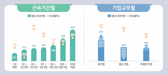 근속 기간별 임금 상승률은 '2년~3년 미만'이 4.3%(14만 원)였으며 '3년 이상 5년 미만'이 3.0%(11만 원)였다. '20년 이상'은 2.7%(22만 원) 늘었으며 '5년 이상 10년 미만'은 1.9%(8만 원), '10년 이상 20년 미만'은 1.7%(10만 원) 올랐다.