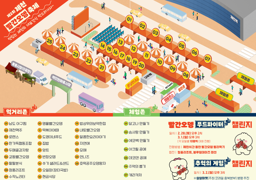 축제 기간 제천역 광장에는 모두 25개의 레트로 감성 포장마차 거리 조성. 교동빨간오뎅, 명물빨간오뎅 등 지역 상인들이 대거 참여해 각자 다른 레시피의 빨간오뎅으로 방문객 유혹.