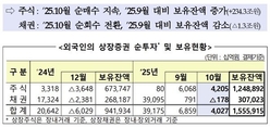 [IE 금융] 지난달 외국인이 국내 증시에 4조2050억 원을 순투자했다. 이는 6개월째다. 14일 금융감독원(금감원)이 발표한 10월 외국인 증권투자 동향에 따르면 지난달 외국인은 유가증권시장에서 4조1950억 원, 코스닥 시장에서는 100억 원어치 주식을 사들였다. 이 기간 외국인의 상장주식 보유액은 1248조9000억 원으로 전체 시가총액의 30.1%에 해당했다. 국가별로 보면 미국이 511조1000억 원으로 외국인 전체 보유액의 40.9%를 차지했으며 유럽 395조5000억 원(31.7%), 아시아 173조9000억 원(13.9%) 순이었다. 또 영국(2조4000억 원), 아일랜드(1조3000억 원), 노르웨이(8000억 원) 등이 순매수한 반면, 미국은 1조 원 가량 순매도했다. 채권시장에서는 상장채권 3조8210억 원을 순매수했지만 3조9990억 원이 만기 상환되며 1780억 원 규모 순회수로 전환됐다. 이는 한 달 만이다. 지난달 말 기준 외국인의 상장채권 보유액은 307조 원으로 전월보다 1조3000억 원 감소했으며 상장채권 잔액 대비 보유 비중은 11.2%였다. 채권 종류별로는 국채에서 3조 원 순투자를 기록했지만, 특수채에서는 3조1000억