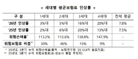 [IE 금융] 내년 실손의료보험(실손보험) 전체 보험료가 평균 7.8% 인상된다. 이는 최근 5년간 실손보험의 전체 인상률 평균(보험료 기준 가중평균)인 연평균 9%보다 1.2%포인트(p) 낮다. 23일 생명·손해보험협회에 따르면 내년 실손보험 전체 인상률 평균은 약 7.8%로 집계됐다. 세대별로 보면 ▲1세대 인상률 3%대 ▲2세대 인상률 5%대 ▲3세대 16%대 ▲4세대 20%대 인상 등이다. 그러나 이는 보험사들의 평균 수준이며 상품 갱신주기·종류, 가입자 연령·성별, 보험사별 손해율 상황 등에 따라 다르게 적용된다. 실제 보험료 조정은 개인별 보험계약이 실제 갱신되는 시기 보험사에서 발송하는 보험료 갱신 안내장 등을 통해 확인할 수 있다. 세대별 갱신 주기는 1세대 3~5년, 2세대 1~3년, 3·4세대 1년 등이다. 이들 협회 관계자는 "보험업계는 비급여 과잉진료, 보험사기 등으로 인한 보험금 누수를 방지함으로써 실손보험의 누적 적자를 해소하고 가입자의 보험료 부담을 합리화하기 위해 지속적으로 노력하고 있다"며 "이를 위해 필수의료 중심의 의료체계 정상화 및 국민 의료비 부담 감소, 적정 의료비 보장 등 실손보험 개편 방안 이행을 위해 정부 정책에