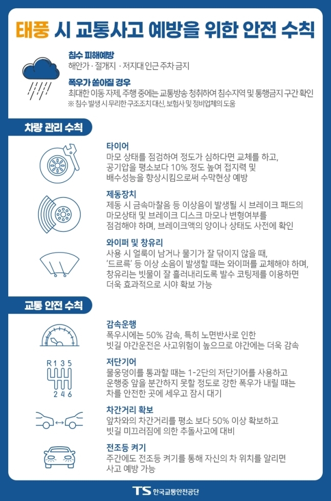 한국교통안전공단 권병윤 이사장은 "강풍을 동반한 폭우는 도로변 간판·현수막 등이 추락하거나 도로시설이 쓰러지는 등 예기치 못한 사고가 발생할 수 있기 때문에 운전자들의 각별한 주의가 필요하다"며 "강한 비·바람으로 인해 우산 등으로 시야를 가린 보행자 등을 고려해 운전자는 전방주시에 더욱 노력해야 한다"고 설명했다.