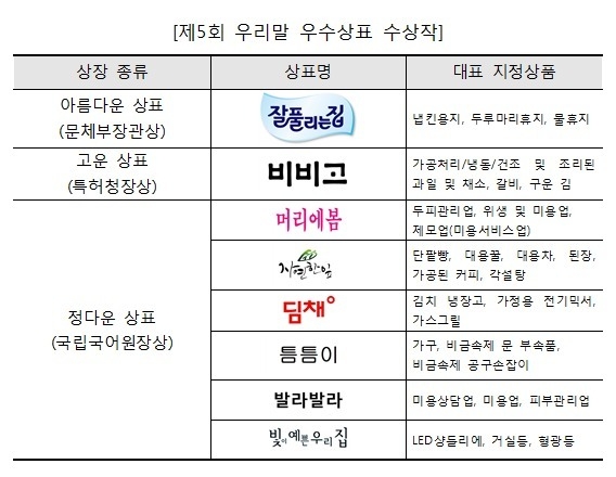 6일 특허청에 따르면 제574돌 한글날을 맞아 열린 제5회 우리말 우수상표 선정 대회에서 문화체육관광부장관상인 '아름다운 상표'에 '잘풀리는집'이 꼽혔다. 또 특허청장상인 '고운 상표'에는 '비비고'가 받았다. 국립국어원장상인 '정다운 상표'에는 ▲머리에봄 ▲자연한잎 ▲딤채 ▲틈틈이 ▲발라발라 ▲빛이예쁜우리집이 뽑혔다.
