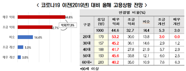 특히 20대 응답자의 경우 올해 고용상황이 '매우 악화 될 것'이라고 답한 수가 절반(53.2%)을 넘은 반면 '매우 개선될 것'이라는 인원은 '0%'였다.