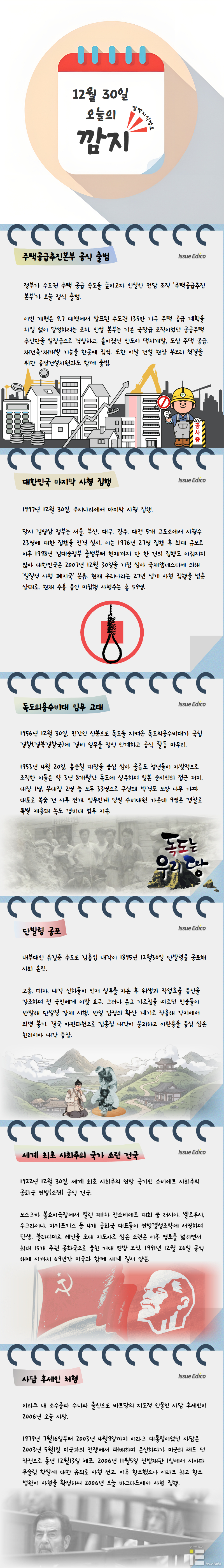 이라크 내 소수종파 수니파 출신으로 바트당의 지도적 인물인 사담 후세인이 2006년 오늘 사망. 1979년 7월16일부터 2003년 4월9일까지 이라크 대통령이었던 사담은 2003년 5월1일 미국과의 전쟁에서 패배하며 은신하다가 미군의 레드 던 작전으로 같은 해 12월13일 체포. 2006년 11월5일 전범재판 1심에서 시아파 무슬림 학살에 대한 유죄로 사형 선고. 이후 항소했으나 이라크 최고 항소법원이 사형을 확정하며 2006년 오늘 바그다드에서 사형 집행.