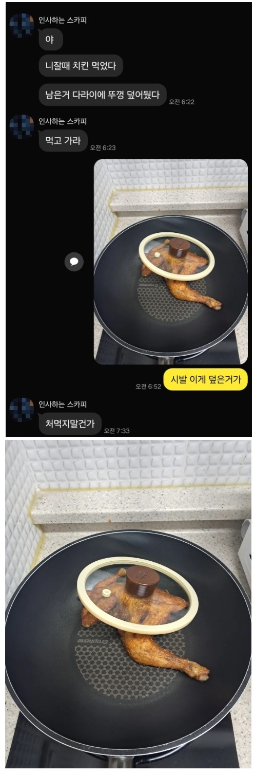 여름인가봐 배만 덮었네. 하긴 프라이팬 위는 덥겠다.