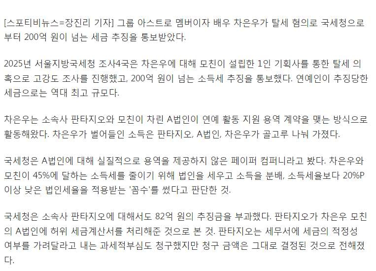 차은우, 母 회사로 탈세 의혹…200억 세금 추징 '역대 연예인 최고 금액'