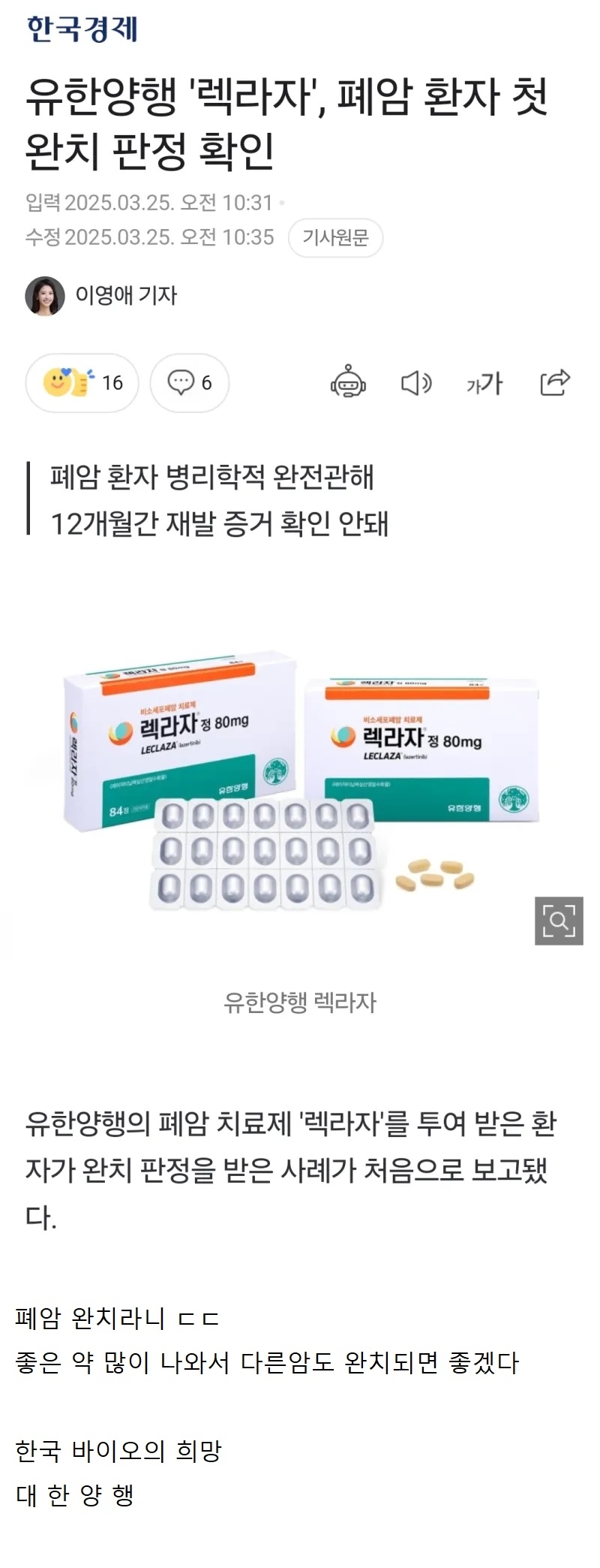 유한양행 '렉라자', 폐암 환자 첫 완치 판정 확인