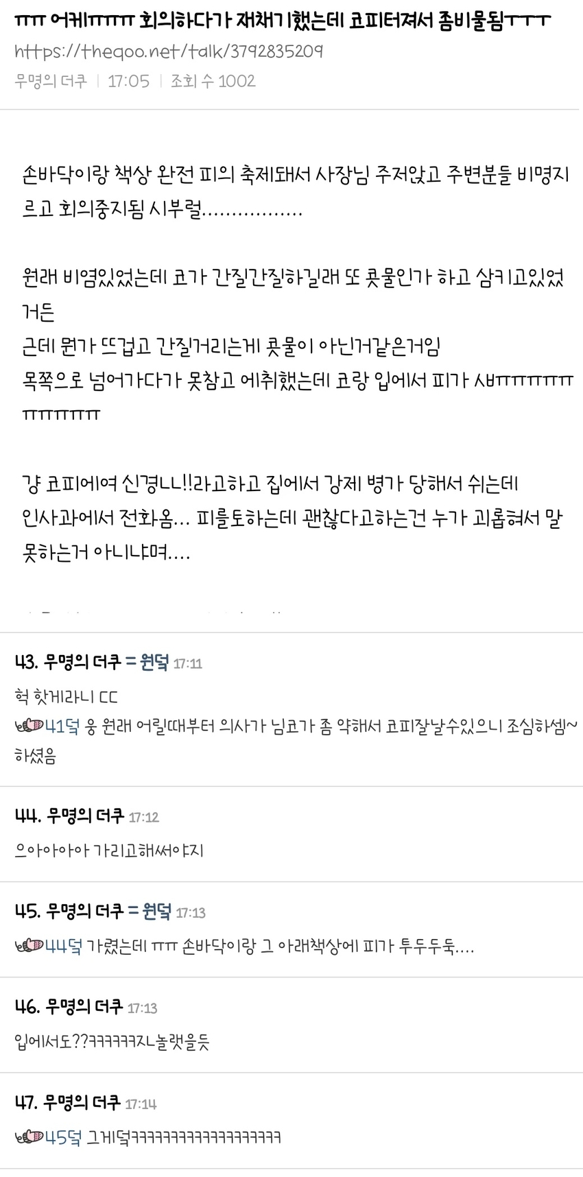 회의중 누가 피 뿜으면서 켈록이며 괜찮아요 그냥 코피에요 하면