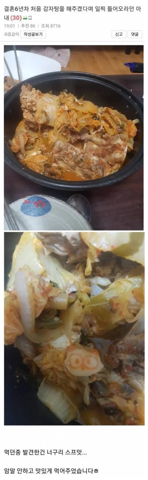 * | 결혼 6년차 아내가 처음으로 해준 감자탕 [3] | 향이있는밤 | 2025/10/08 |